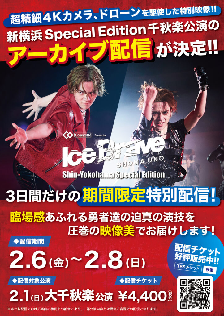 皆さまの熱い声にお応えし、宇野昌磨アイスショー「Ice Brave 新横浜 Special Edition」千秋楽公演のアーカイブ配信が決定!超精細4Kカメラやドローンカメラを駆使した特別映像でお届けいたします。